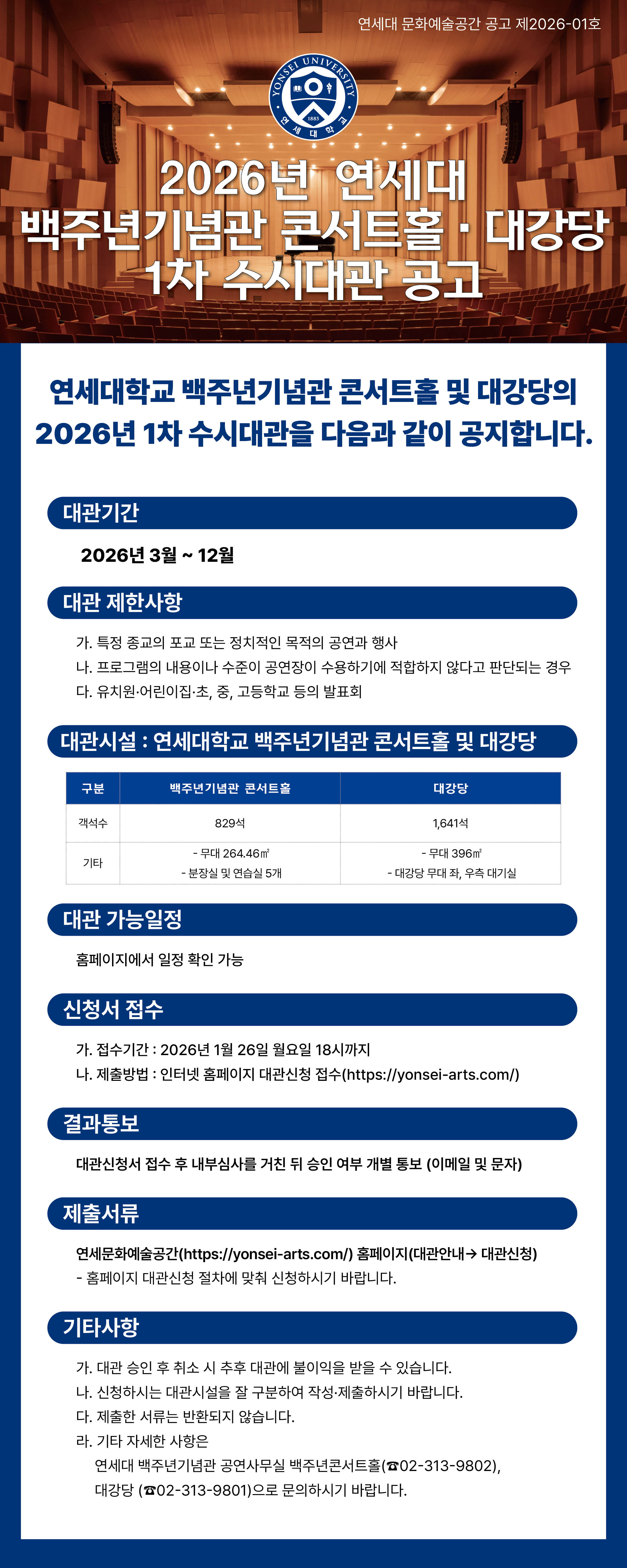 연세대 백주년기념관 콘서트홀 및 대강당에서는 다음과 같이 2026년 1차 수시대관을 공고합니다. 역량 있는 문화예술단체 및 예술인들의 많은 관심과 신청 바랍니다.