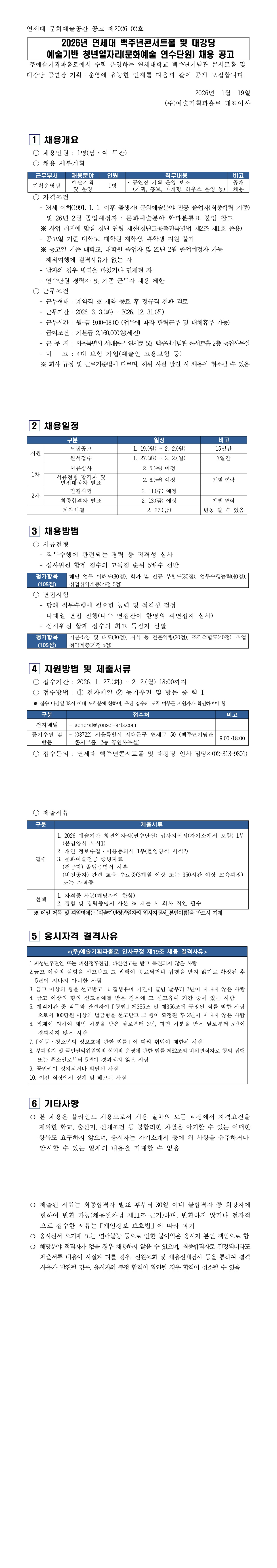 예술기반 청년일자리지원 연수단원 채용_(주)예술기획파홀로_연세대 콘서트홀 및 대강당