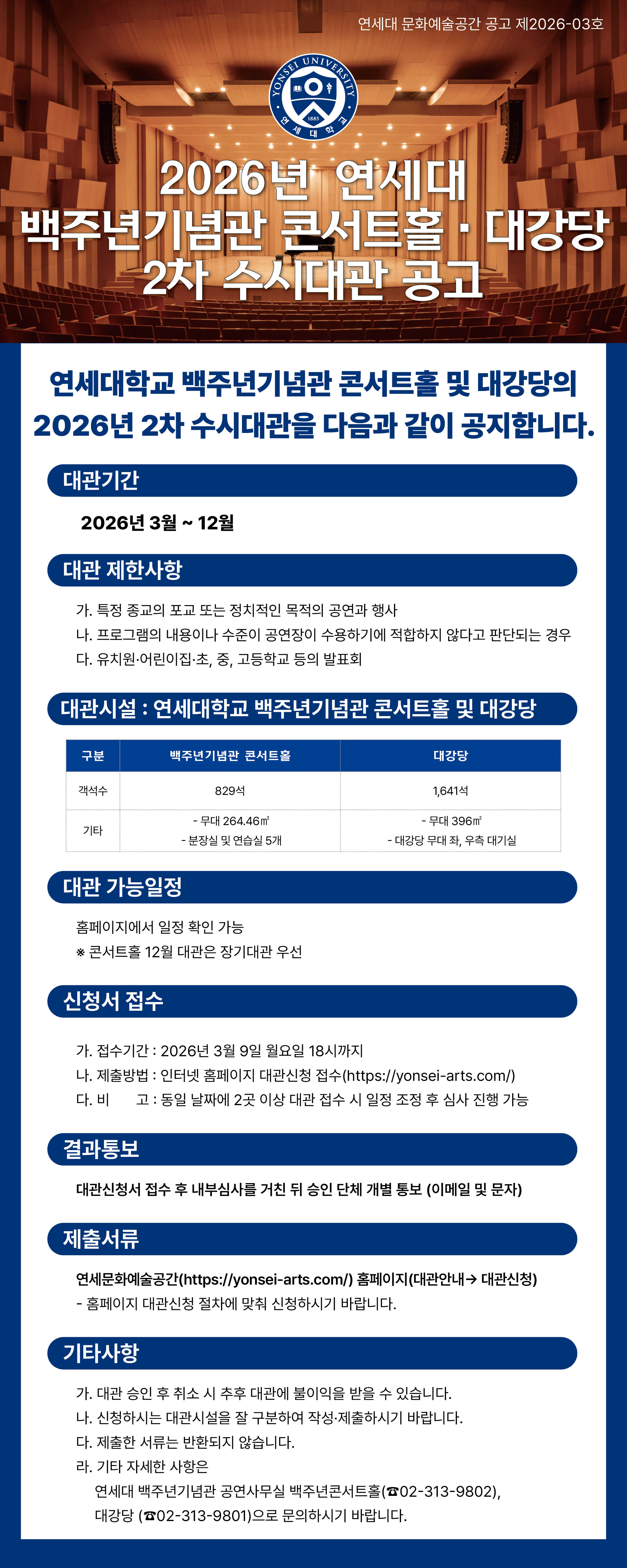 #연세대학교 #2026년수시대관 #수시대관 #대관공고 #대관신청 #대관접수 #공연장대관 #백주년기념관 #콘서트홀 #공고안내 #대관안내 #대강당 #예술인 #예술단체