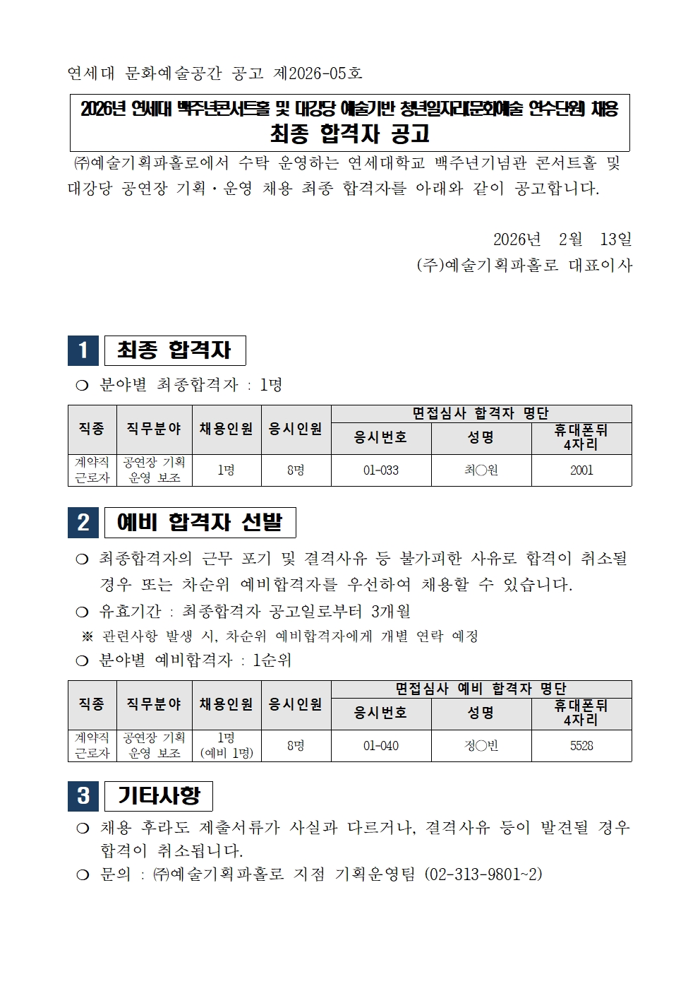 예술기반 청년일자리지원 연수단원 채용_최종합격자 공고